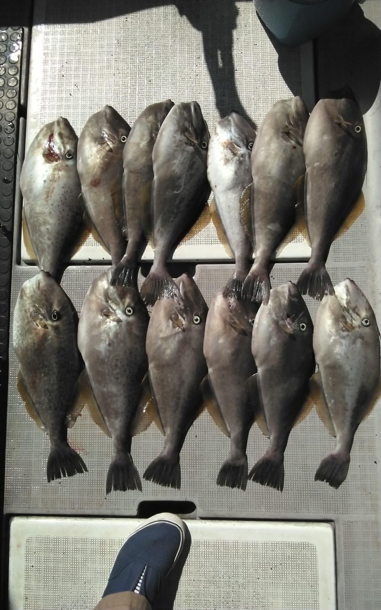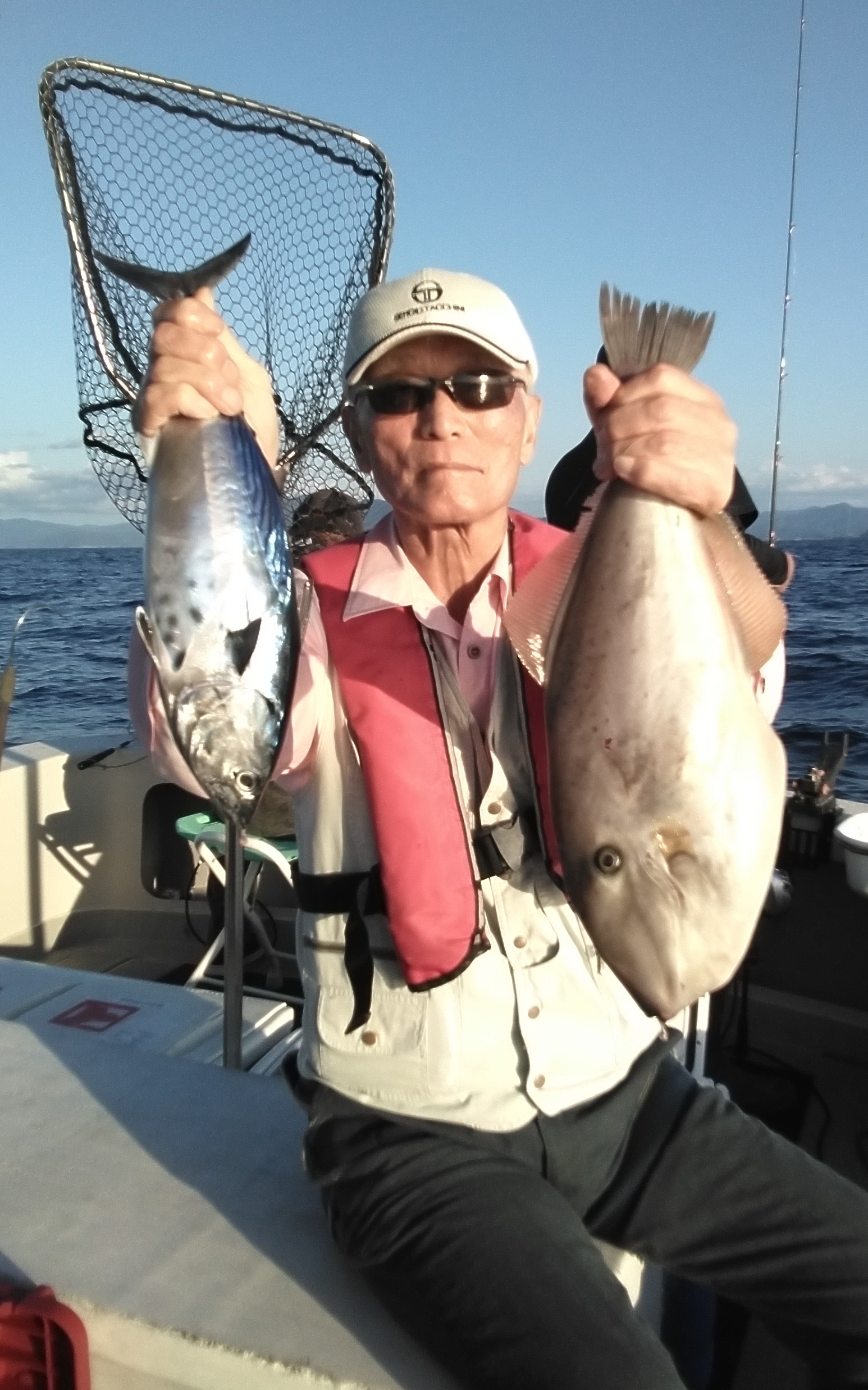 10月1日ふかせ釣りでスマガツオ9匹、イサキ2匹、ウスバハギ13匹、小鯛1匹でした