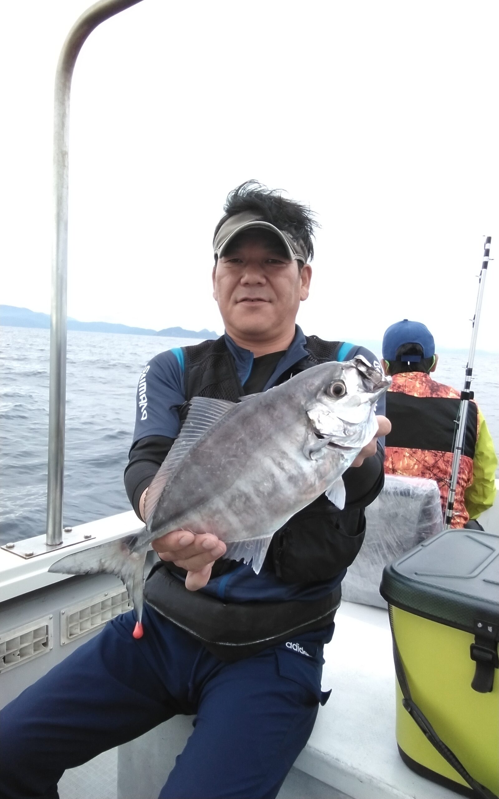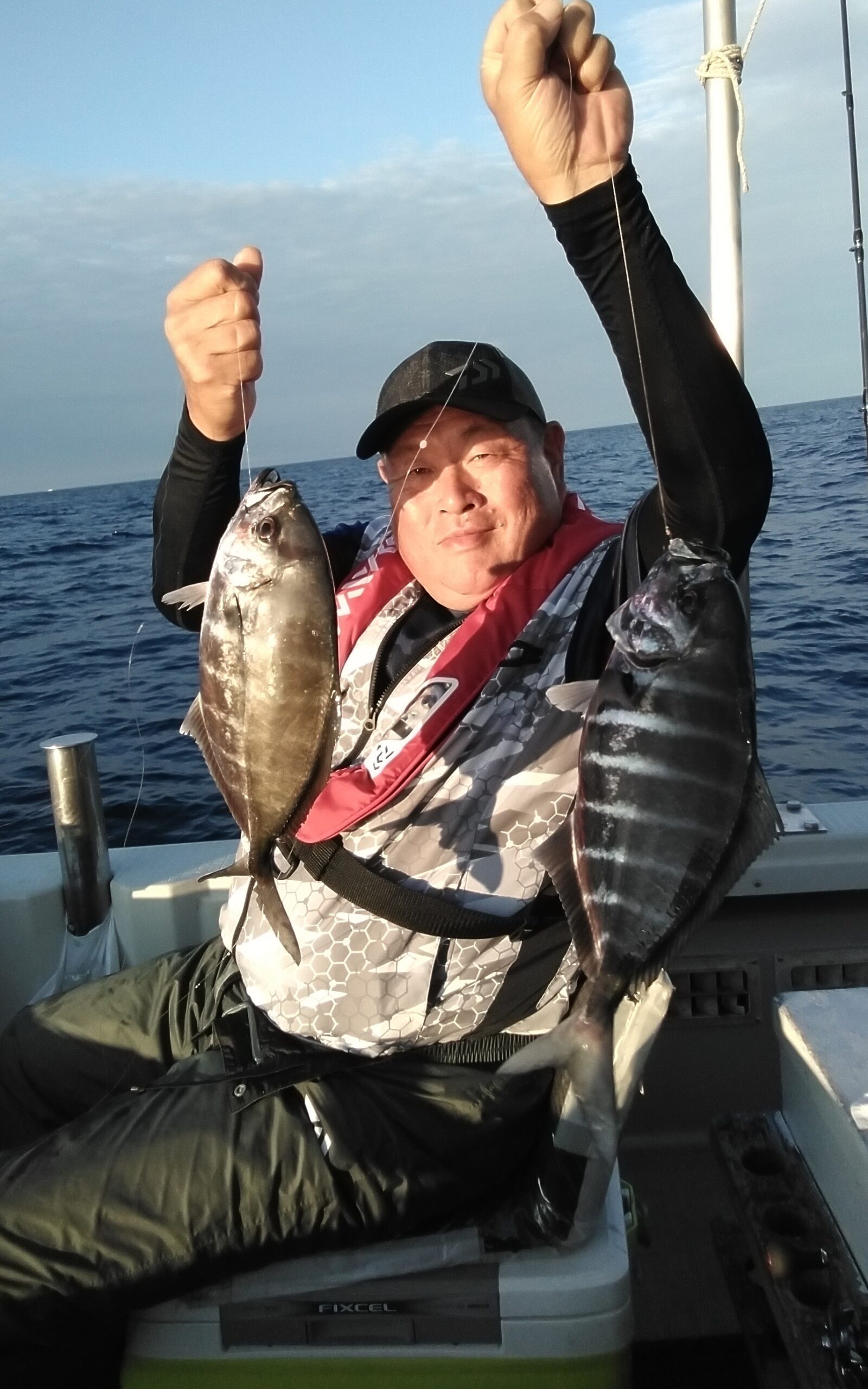 今日は、沖から緩やかなうねりが残り、南風の吹く中での釣りで、釣り始めると、気持ち良く竿を大きく曲げ、引き込も良く、調子良いなと言っていたら、隣の方もアタリが有り大きく曲げて居る、姿を見せたのはオキアジの40cmでした。其の隣の方も来たと、竿を大きく曲げて居て、ダブルヒットで大慌てでした。その後も、お一人様がヒットすれば、隣の方もヒットして来ました。タイもポツポツとヒットし、皆さんのクーラーの中にはオキアジが6匹~9匹と賑やかに収まって居ました。 いつもありがとう御座います 温暖化現象の為か水温が上がり、今まで見なかった、魚種が釣れる様になって来ました。(スジフエダイ、オキアジ、マナガツオ) 此れから若狭湾はどう変わって行くのでしょうかね?