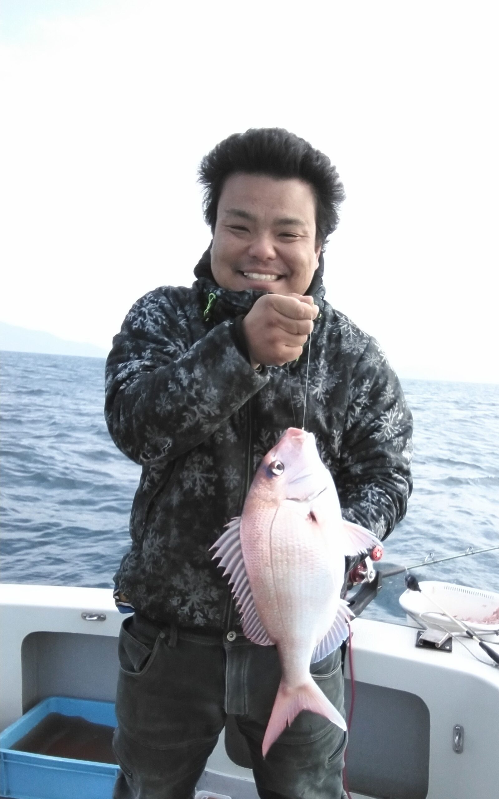 今日は、青空に成り大荒れも収まったので、仲間の船長と、二人で出船する事に成り、沖に着いて釣り始めると、潮は緩やかに流れ、撒き餌が効き始めると、タイがポツリポツリとヒットし始めました。その後ワラサとハマチのダブルヒットして大盛り上がりましたが、風が南風から徐々に西風に変わり、アンカーロープに絡む状態で、ワラサがヒットして駄目だと、思って居たが何とか交わして取り込んだ、暫くすると北風に変わり、180度回転したが、アンカーを打ち変える事無く、タイ、ブリとヒットして来て楽しみました。